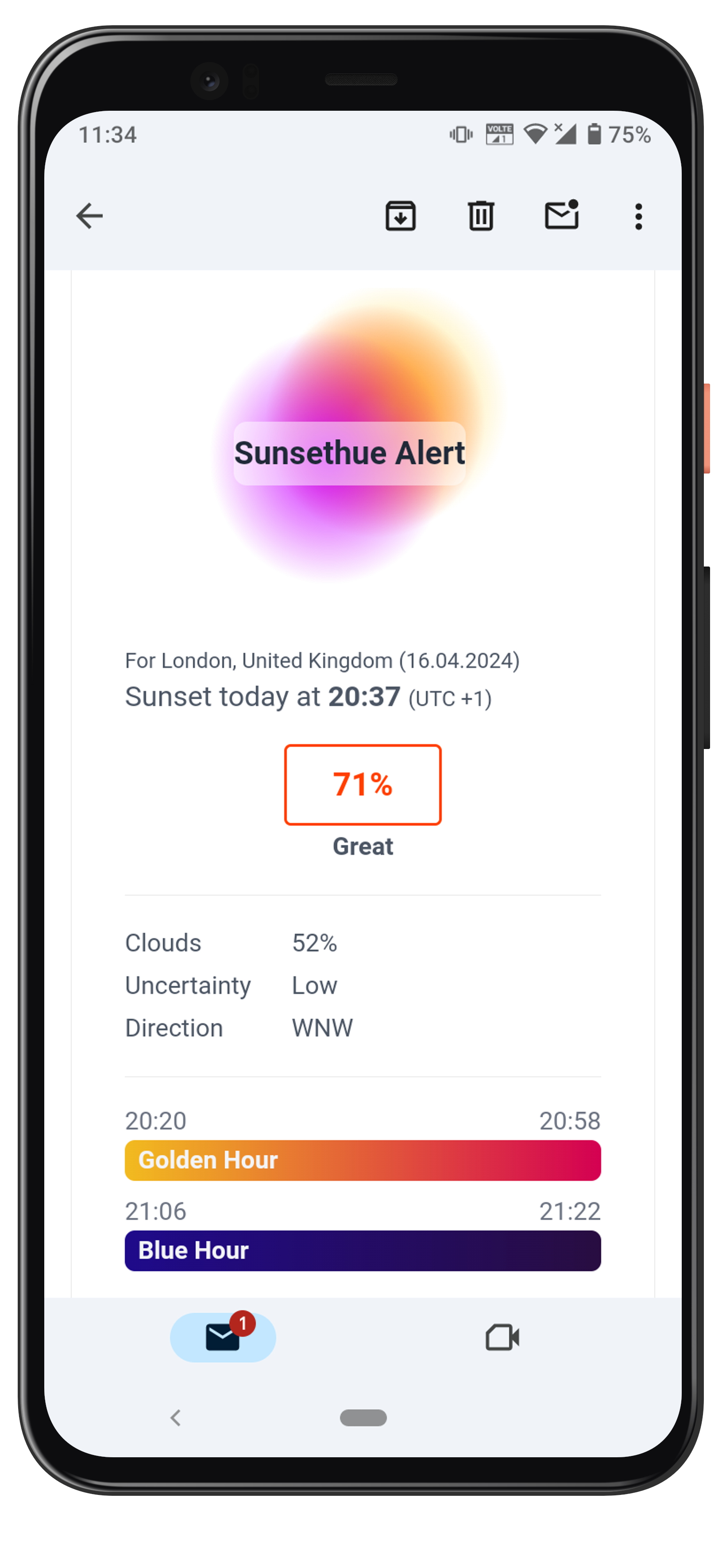 Get notified when the sunrise or sunset forecast is desirable for your selected location. Sign up today, and never miss a great sunset again!